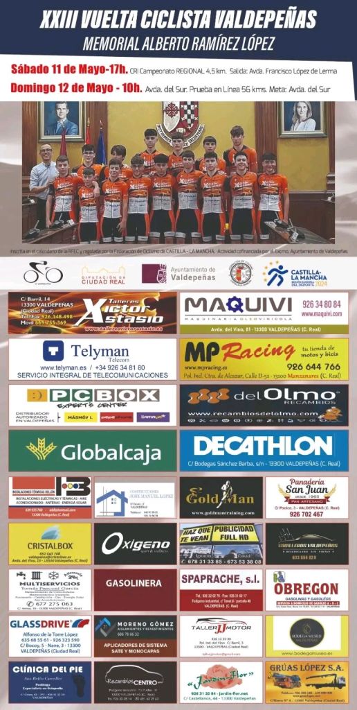 Este fin de semana la XXIII Vuelta Ciclista Valdepeñas ‘Memorial Alberto Ramírez López’ en la que participarán un gran número de corredores cadetes de la Comunidad. El sábado, día 11 de mayo, 17:00 horas, se iniciará una contrarreloj de 4,5 kilómetros que vestirá al nuevo campeón regional. El domingo, a las 10:00 horas, tendrá lugar la prueba en línea de 56 kilómetros.