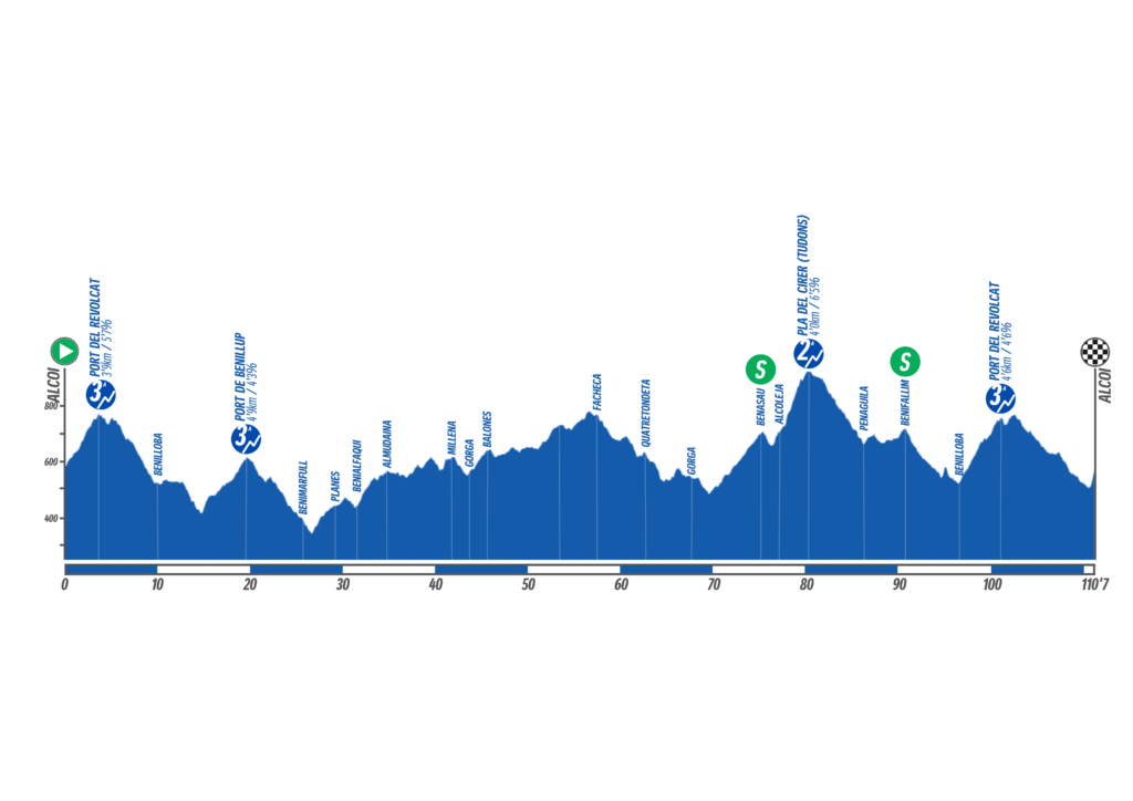 Una vez coronada la subida, la carrera transitará por un rápido descenso hasta llegar a la siguiente complicación de la jornada, el Port de Benillup (3ª categoría). Tras este exigente arranque, la carretera dará un respiro a los corredores hasta llegar a Benifarfull, donde comenzará un tramo siempre ascendente y repleto de repechos de 30 kilómetros que atravesará las localidades de Planes, Benialfaqui o Millena entre otras.