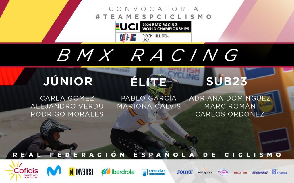 El seleccionador nacional, Alejandro Alcojor, ha convocado para la cita por el maillot arcoíris a un total de ocho pilotos de las categorías júnior, sub23 y élite. En categoría júnior estará presente Carla Gómez, que ya fue finalista el año pasado en Glasgow, además de Alejandro Verdú y Rodrigo Morales. Adriana Domínguez, Marc Román y Carlos Ordóñez serán los representantes en la categoría sub23, mientras que Mariona Calvis y Pablo García, quien ya fue finalista en sub23 también en Glasgow, competirán en categoría élite. Con el BMX Alcoy participa Vicente García.
