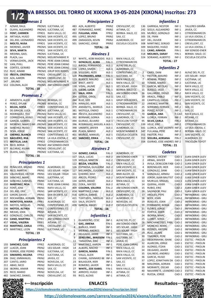 La III Prova Bressol del Torró de Xixona de Escuelas y Cadetes se disputará el domingo, 19 de mayo. Será la octava jornada Challenge de Escuelas de la provincia de Alicante. Recordar que el Club Ciclista Xixona ha cambiado la ubicación de la carrera por la coincidencia con las comuniones, al polígono Segorb, con salida y meta en la calle Joan Fuster, (Colegio Sagrada Familia y la empresa Antiu Jijona), con el fin de evitar las molestias por dicho acontecimiento religioso y sobre todo, para prevenir accidentes por la aglomeración de gente que vaya a dicho actor. El recorrido será el mismo de la primera edición con una distancia de 2 kilómetros y 300 metros, con un desnivel de 61 metros para Infantiles y Cadetes.