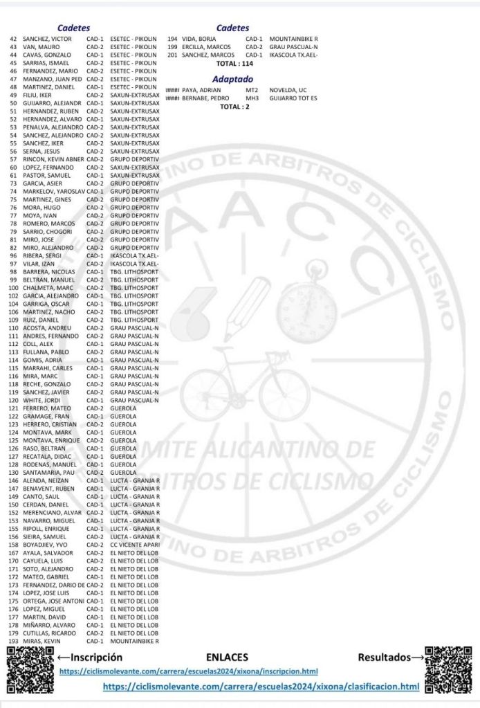 La orden de las carreras será el mismo: 9:00 horas CADETES. 10.30h. Escuelas (INFANTILES, PROMESAS, PARACICLISME, PRINCIPIANTES Y ALEVINES).