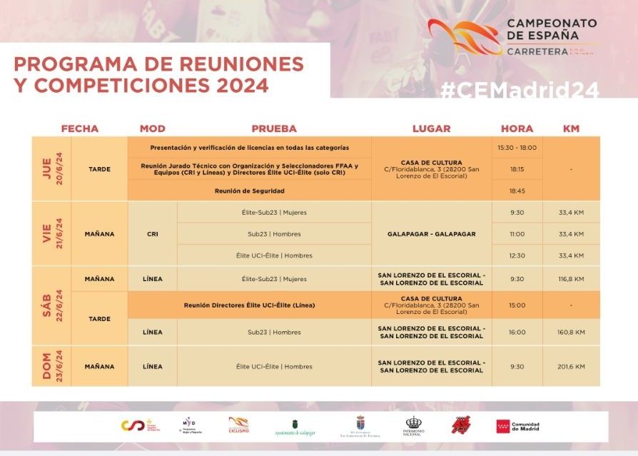 José Luis López Cerrón, presidente de la Real Federación Española de Ciclismo, resalta en relación a la celebración de esta nueva edición del Campeonato de España Élite-Sub23 de carretera que “la inmejorable experiencia que brindó el pasado año la Comunidad de Madrid al nacional nos llevó a todas las partes a un rápido entendimiento para repetir emplazamiento en este 2024. Creemos que es un inmejorable escenario para que nuestros ciclistas den muestras de todo su talento y vuelvan a brindarnos un gran espectáculo, que además quedará engalanado por la presencia del Monasterio de San Lorenzo de El Escorial, uno de los grandes monumentos de nuestro país. Por ello, desde la Real Federación Española de Ciclismo queremos agradecer a la Comunidad de Madrid su apuesta por el deporte y el ciclismo y a la Federación Madrileña de Ciclismo por todo el trabajo que han realizado para que este acuerdo haya podido producirse de nuevo”.
