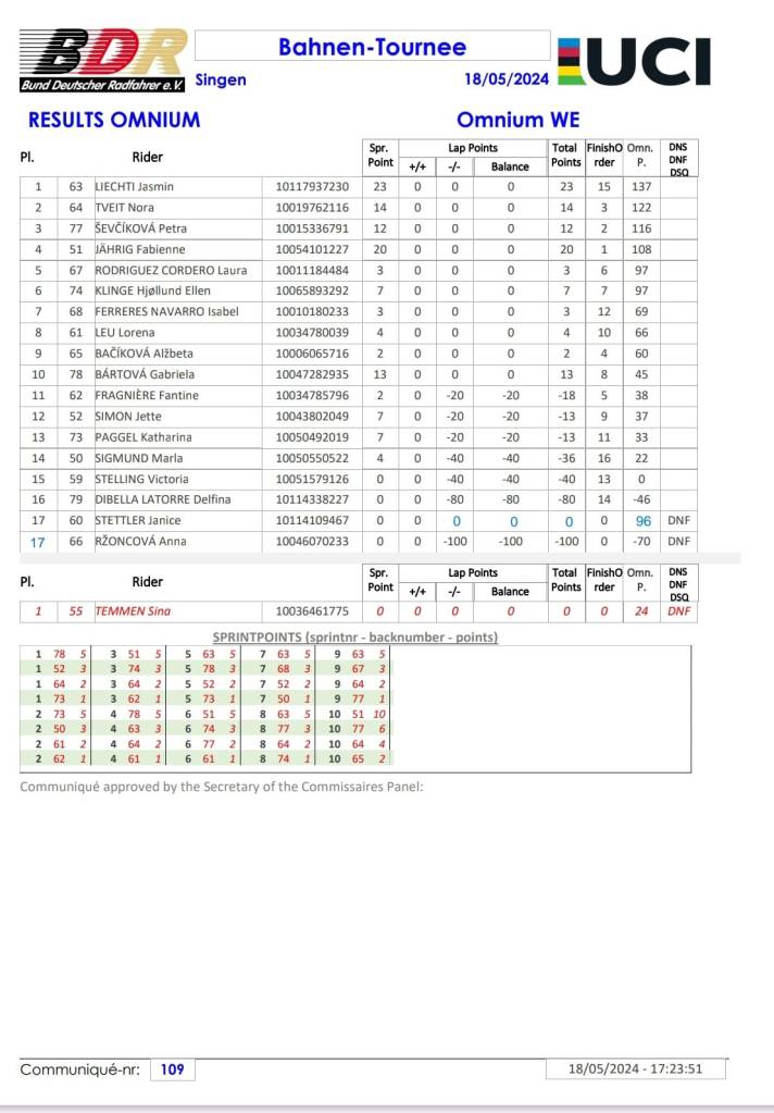 El domingo, de 10:00 a 17:40, tendrá lugar la segunda y última jornada de la Bahnen Tournee de Singen, con ómnium masculino, y keirin y eliminación femenina, así como scratch femenino y dos pruebas específicas para sub23 (madison y scratch), y una competición de mediofondo.
