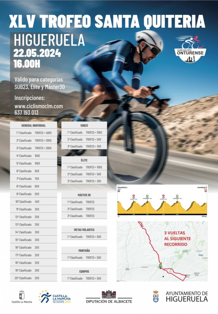 El miércoles, 22 de mayo, se disputa en Higueruela, a partir de las 16 horas, la 45 edición del Trofeo Santa Quiteria para corredores Élites, Sub-23 y Máster 30. La prueba mantiene su diseño: 162 kilómetros y tres vueltas a un circuito con salida y meta en Higueruela y paso por Pozo Lorente. Un trazado muy exigente con tres puertos de montaña y unos interesantes 1800 metros de desnivel acumulado, dos de ellos puntuables, que añade un premio de Metas Volantes al paso por el contrameta.
