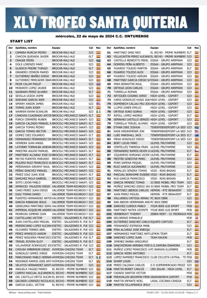 En la línea de salida estarán Brocar Alé, Essax, Ulevel Frutamine, High Level Gsport y Esetec Salazones Ricardo Fuentes. También se ponen el dorsal Tomás Miralles (Rías Baixas), tras ganar la Challenge Alicante Interior; Eusebio Pascual (Rías Baixas; y Raúl Peñaranda (Brócoli). Lista de inscritos.