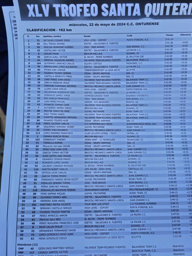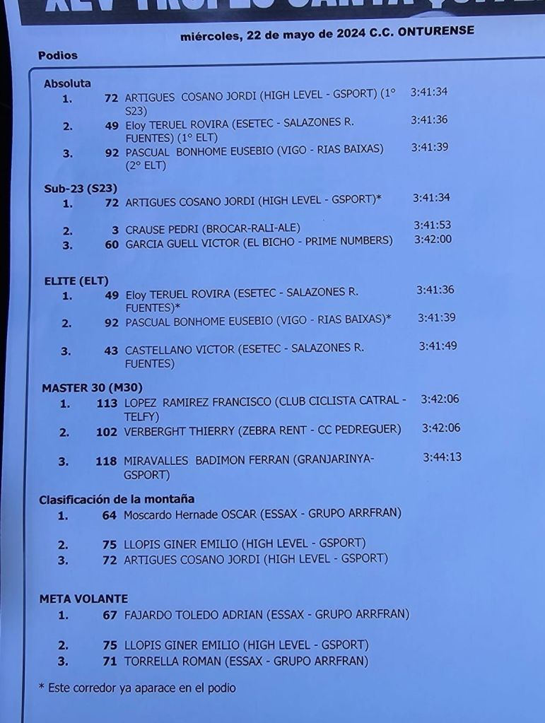 Jordi Artigues (High Level Gsport) se ha impuesto hoy en Higueruela en la 45 edición del Trofeo Santa Quiteria para corredores Élites, Sub-23 y Máster 30. Eloy Teruel (Esetec-Salazones Ricardo Fuentes) y Eusebio Pascual (Rías Baixas) han completado el podio. Emilio Llopis (High Level-Gsport) se ha llevado la montaña y Adrián Fajardo (Equipo Essax-Grupo Arfran) las metas volantes. Por equipos, el Esetec Salazones Ricardo Fuentes ha sido el mejor.