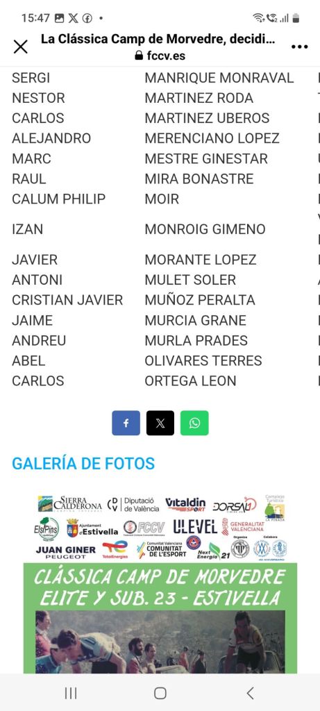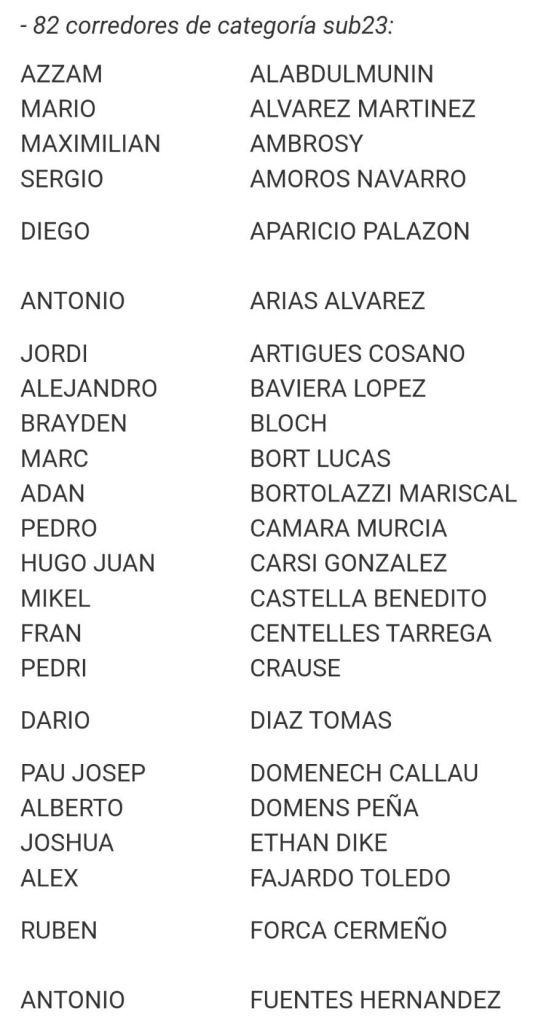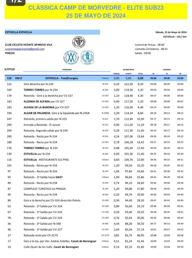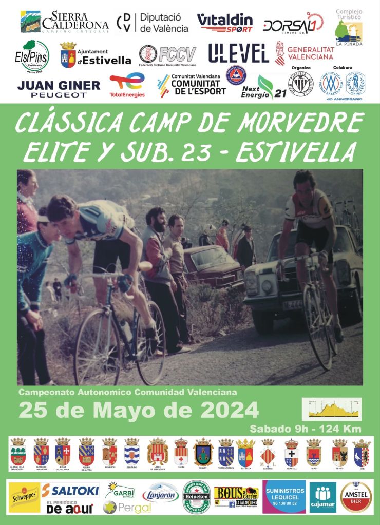 El sábado, día 25 de mayo, a las 9:00 horas, se dará el pistoletazo de salida de la Clàssica Camp de Morvedre Élite y Sub23 desde el campo de fútbol de Estivella. Los títulos de campeones de la Comunidad Valenciana están en juego. Óscar Moscardó (Equipo Essax) y Mario Granero (Brocar Alé) lograron el triunfo y el correspondiente maillot en la edición de 2023 disputada en Benircarló, más concretamente, en la Ronda Ciclista al Maestrat. Lista de inscritos.