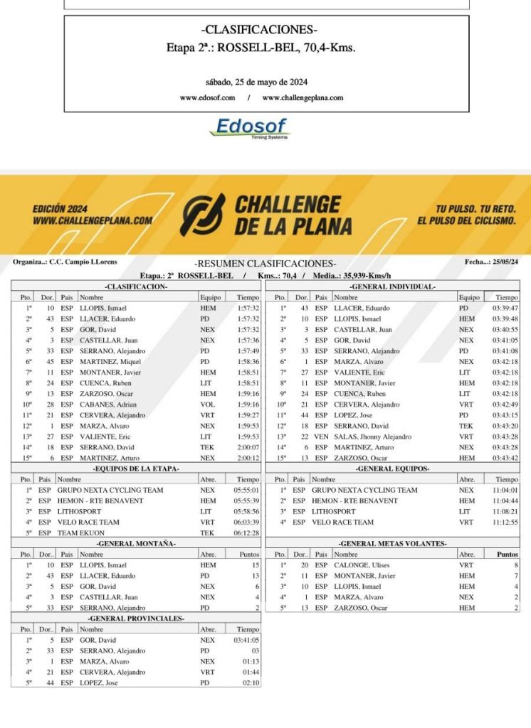 Ismael Llopis (Hemon) se ha impuesto en Bel en la segunda etapa de la Challenge de la Plana tras 70,4 kilometros de recorrido. Tras un apretado esprint ha superado a Edu Llácer, que sigue como líder de la prueba a falta de una jornada. David Gor ha terminado tercero.