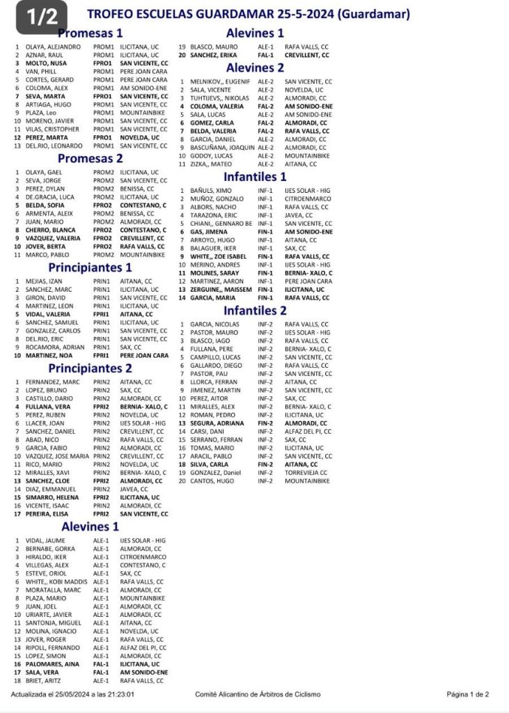 A nivel individual, Alejandro Olaya (UC Ilicitana) y Nusa Moltó (CC San Vicente) se impusieron en Promesas 1; Gael Olaya (UC Ilicitana) y Sofía Belda (CC Contestá), en Promesas 2; Izán Mejías (Aitana) y Valeria Vidal (Aitana), en Principiantes 1; Marc Fernández (Aitana) y Vera Fullana (Bernia Xaló), en Principiantes 2; Jaume Vidal (Ijes Solar) y Aina Palomares (UC Ilicitana), en Alevines 1; Eugeni Melnikov (CC San Vicente) y Valeria Coloma (AM Sonido), en Alevines 2; Ximo Bañuls (Ijes Solar) y Jimena Gas (AM Sonido), en Infantiles 1; Nicolás García (CC Rafa Valls) y Adriana Segura (Almoradí), en Infantiles 2.