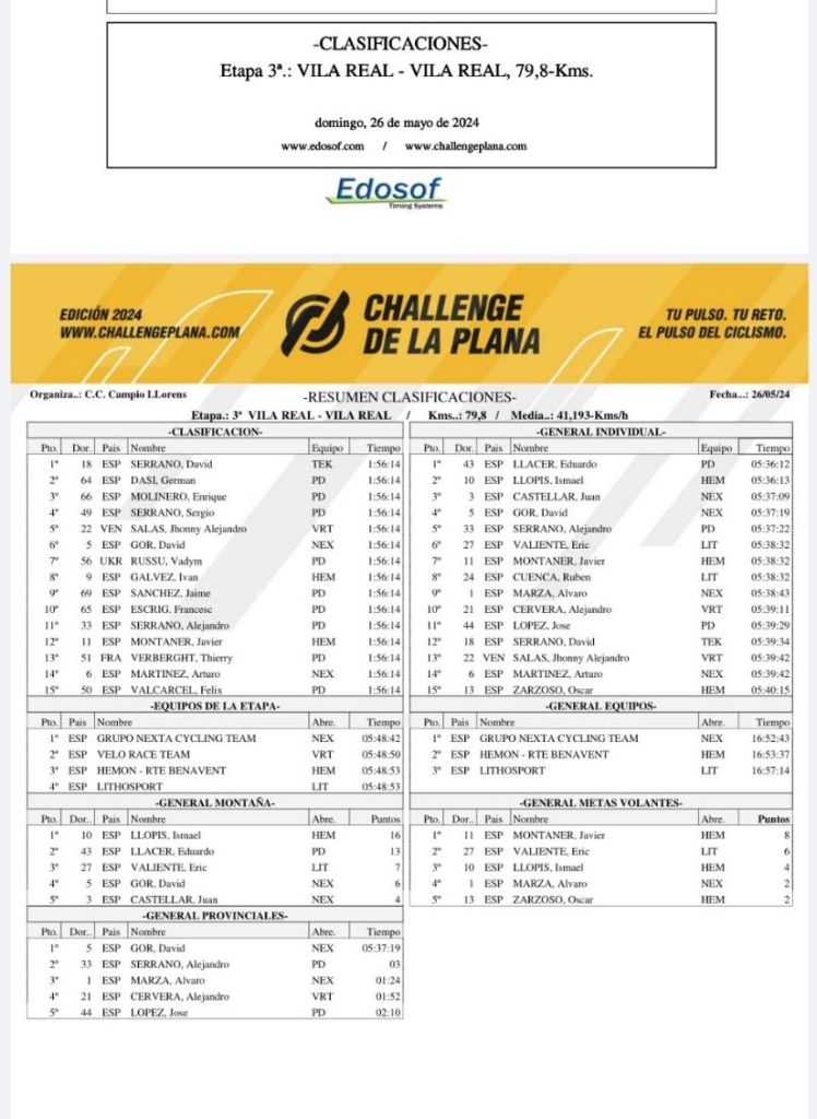 David Serrano se ha impuesto en la tercera y última etapa de la Challenge de La Plana que ha tenido principio y fin en Vila-real después de 79,8 kilómetros de recorrido. Germán Dasi y Enrique Molinero le han acompañado en el podio de la jornada. Eduardo Llàcer ha sido el vencedor de la Challenge por delante de Ismael Llopis y de Juan Castellar.
