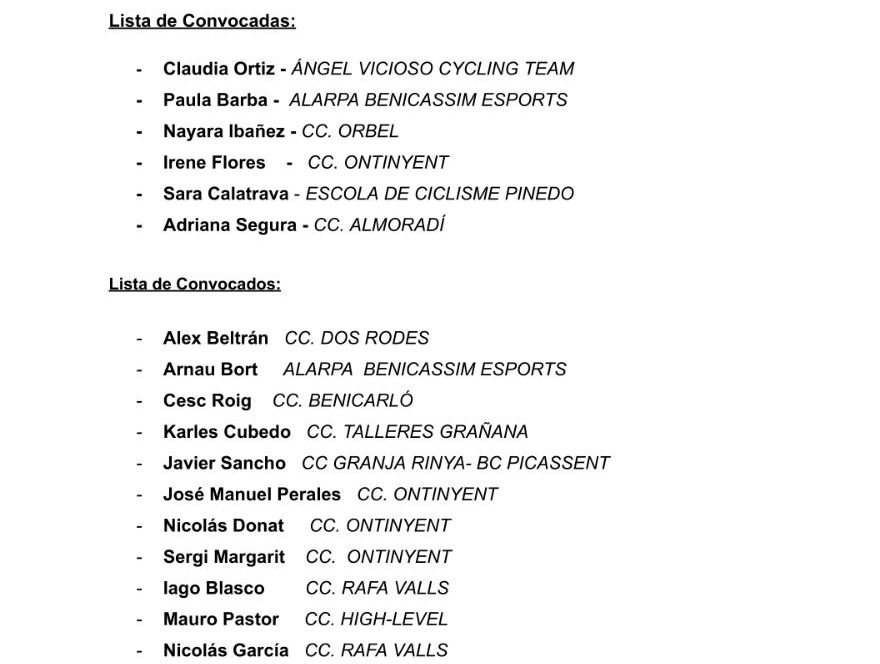 Ari Rambla, seleccionadora Escolar de la FCCV, ha citado para el miércoles, día 29 de mayo, a un grupo de ciclistas de la Comunidad para realizar un nuevo entrenamiento en Lliria, a partir de las 17.30. Acuden a la cita, que tiene como misión preparar al combinado autonómico para el Campeonato de España, los siguientes ciclistas: