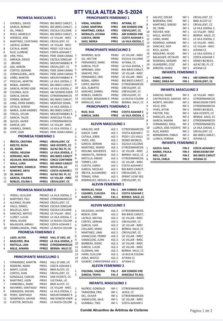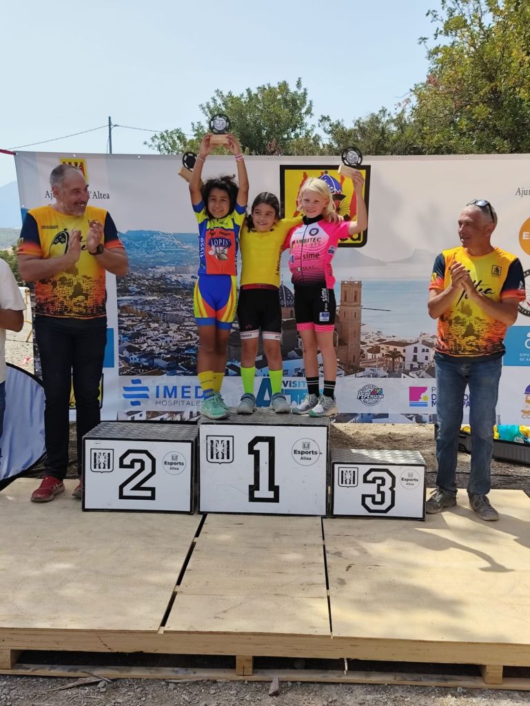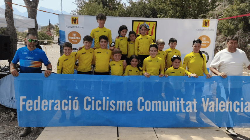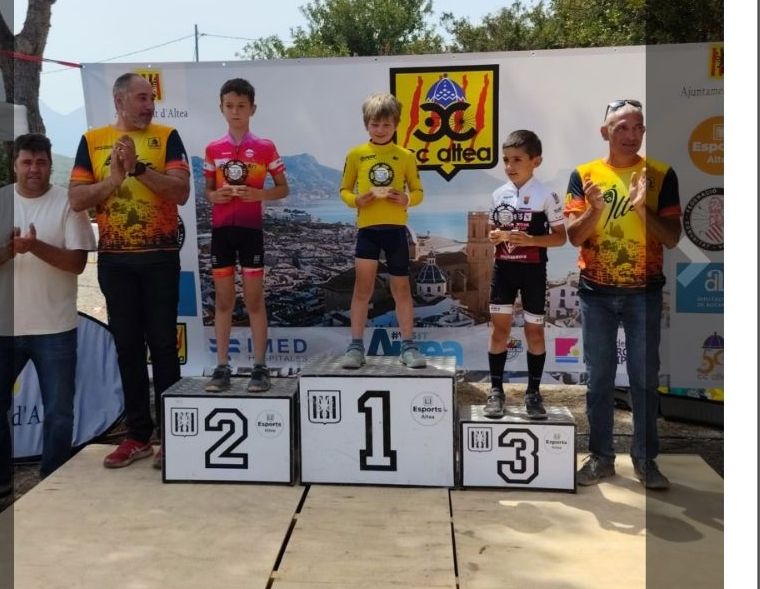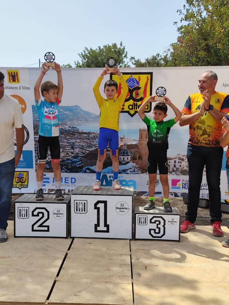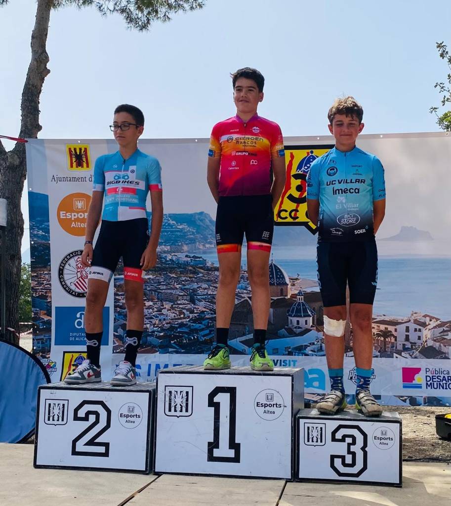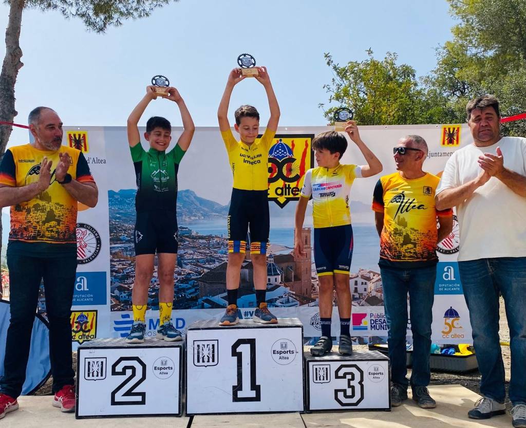 Triunfo en la categoría Infantil 2 de Marc Sancho (UC Villar) y Naia Gasch (Costa Azahar) en el BTT Vila d’Altea de Escuelas. David Chenoll (Big Bikes) y Cristina Iñesta (Crevillent) se impusieron en Promesas 1; Guillem Verdú y Altea Lazo (Vall d’Uixó), en Promesas 2; Martín Fernández (Vall ‘Uixó) y Valeria Vidal (Aitana), en Principiantes 1; Álex Moreno (UC Villar) y Elia Ruiz (Costa Azahar), en Principiantes 2; Iker Hiraldo (Citroen Marcos) y Vega Morales (AM Sonido), en Alevines 1; Javier Delegido (Citroen Marcos) y Valeria Coloma (AM Sonido), en Alevines 2; Gonzalo Muñoz (Citroen Marcos) y Ainhoa Cano (AM Sonido), en Infantiles 1; y los citados Marc Sancho (UC Villar) y Naia Gasch (Costa Azahar), en Infantiles 2.