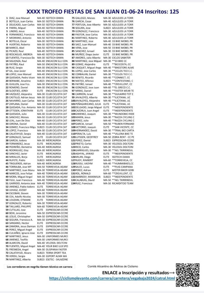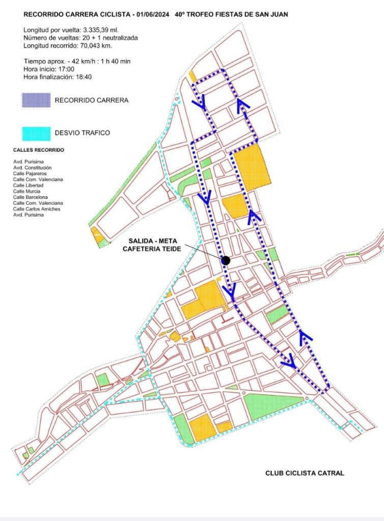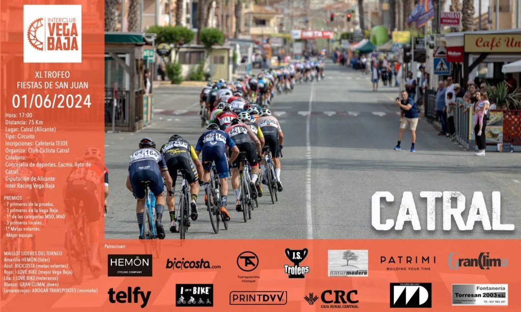 El sábado, día 1 de junio, se disputa en Catral el XL Trofeo Fiestas de San Juan. Será la quinta jornada del Interclub Vega Baja. La salida está prevista para las 16 horas y el pelotón deberá recorrer 70 kilómetros, tras dar 20 vueltas un circuito de poco más de tres km.