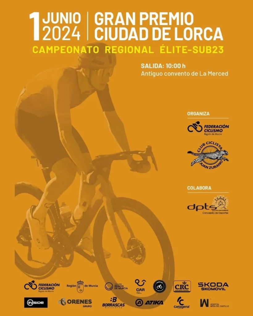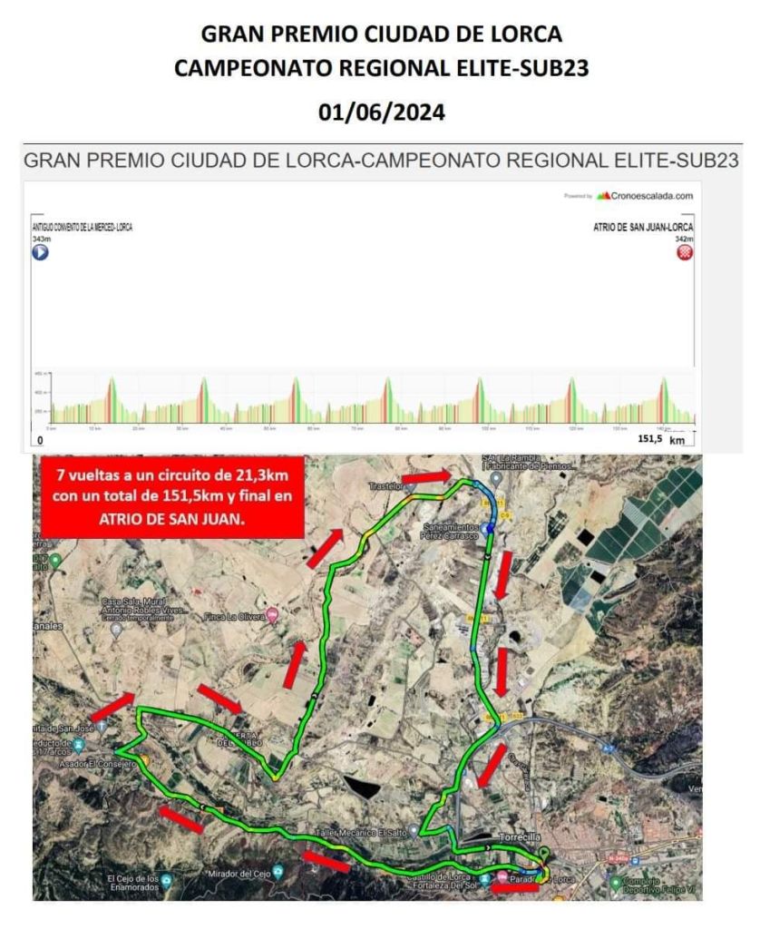 Este sábado, 1 de junio, se conocerán a los nuevos campeones de la Región de Murcia de carretera de las categorías Élite y Sub23. El Gran Premio «Ciudad de Lorca» repartirá los títulos. La prueba, organizada por el CC Juan Zurano se disputa en un circuito de 21,3 kilómetros con un final exigente, estrecho y técnico y un bote de más de 300 euros en premios. Se darán siete vueltas a dicho trazado, en el que destaca en cada uno de los giros el ascenso al alto de La Carrasca (3ª categoría-km 13,6; km 35,3; km 57; km 78,7; km 100,4; km 122,1 y km 143,8). La salida es a las 10 horas.