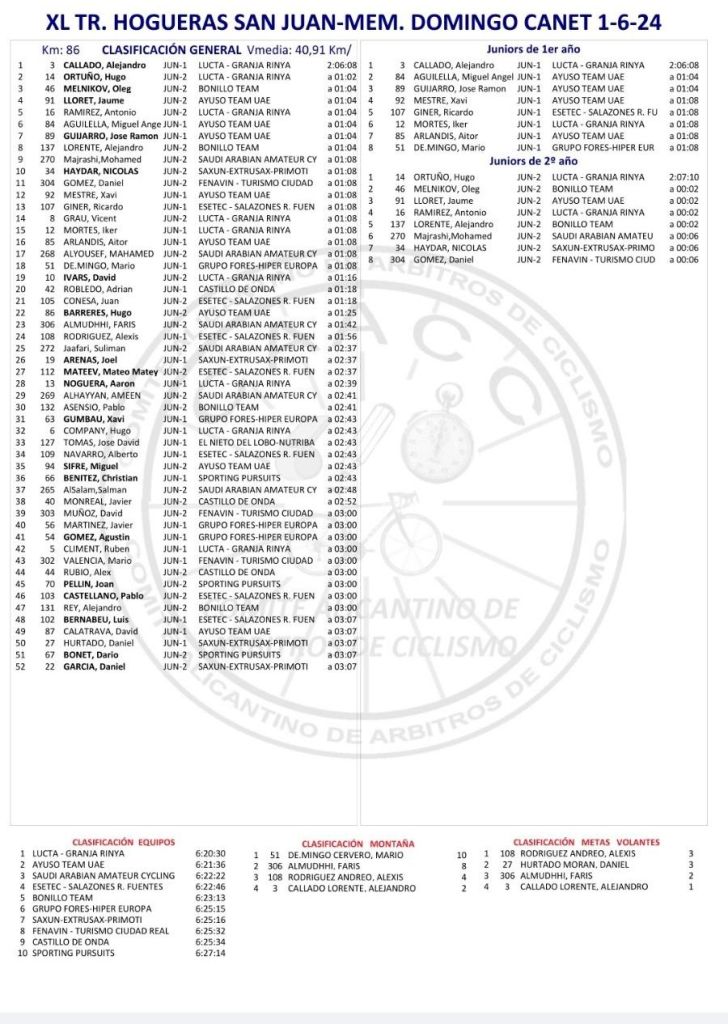 Alejandro Callado (Lucta Granja Rinya) se ha impuesto hoy en solitario en el XL Trofeo Hogueras de San Juan IX Memorial Domingo Canet disputado en Jávea. En la cuarta prueba de la Challenge Ruta Comunidad Valenciana – Gsport- Júnior 2024 Callado ha estado acompañado en el podio por Hugo Ortuño (Lucta-Granja Rinya) y Oleg Melnikov (Bonillo Team). Mario de Mingo (Grupo Forés) se ha llevado la Montaña; Alexis Rodríguez (Esetec Salazones), las Metas Volantes; y, el Lucta-Granja Rinya ha sido la mejor formación.