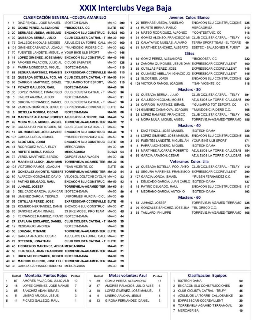 José Manuel Díaz Fenoll sigue como líder del Torneo. Alejandro Gómiz (Bici Costa) es segundo, y, Anselmo Bernabé (Encacon), tercero. Gómiz es el primer élite; Anselmo Bernabé (Encacon) domina en Sub23; Julio Quesada (Catral-Telfy), en M30; Díaz Fenoll, en M40; Francisco Antonio Quesada (Catral Telfy), en Veteranos; y Jozsef Juhasz (Tenerife), en M60. Julio Alberto Amores (Ciclos Sabater) figura al frente de la clasificación de la montaña; Gómiz es el líder de las metas volantes; y el Isotech-Dama es el mejor equipo.