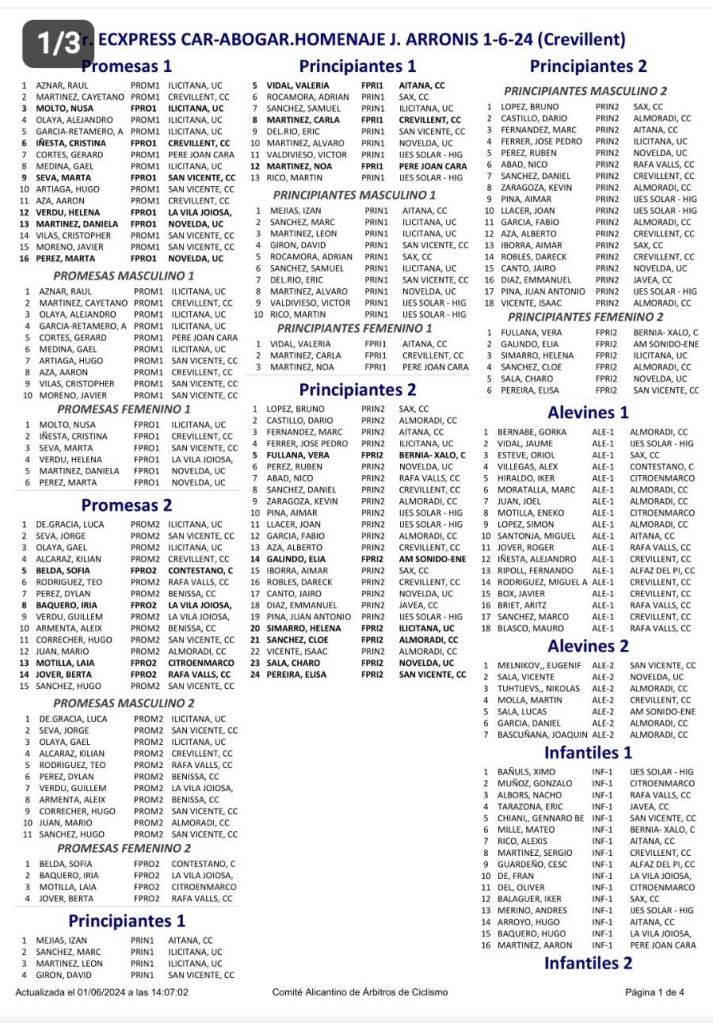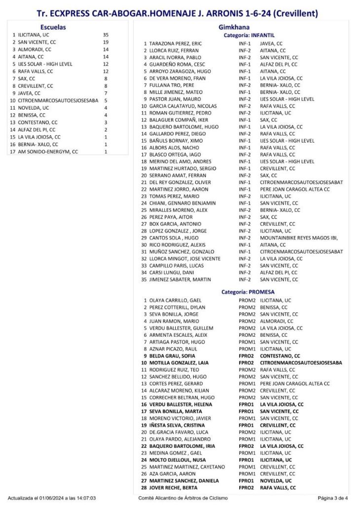 Raúl Aznar (UC Ilicitana) y Nusa Moltó (CC San Vicente) se ha impuesto en Promesas 1; Luca de Gracia (UC Ilicitana) y Sofía Belda (Contestá), en Promesas 2; Izán Mejías (Aitana) y Valeria Vidal (Aitana), en Principiantes 1; Bruno López (CC Sax) y Vera Fullana (Bernia-Xaló), en Principiantes 2; Gorka Bernabé (Almoradí), en Alevines 1; Eugenif Melnikov (San Vicente), en Alevines 2; Ximo Bañuls (Ijes Solar), en Infantiles 1; y Nicolás García (CC Rafa Valls), en Infantiles 2.