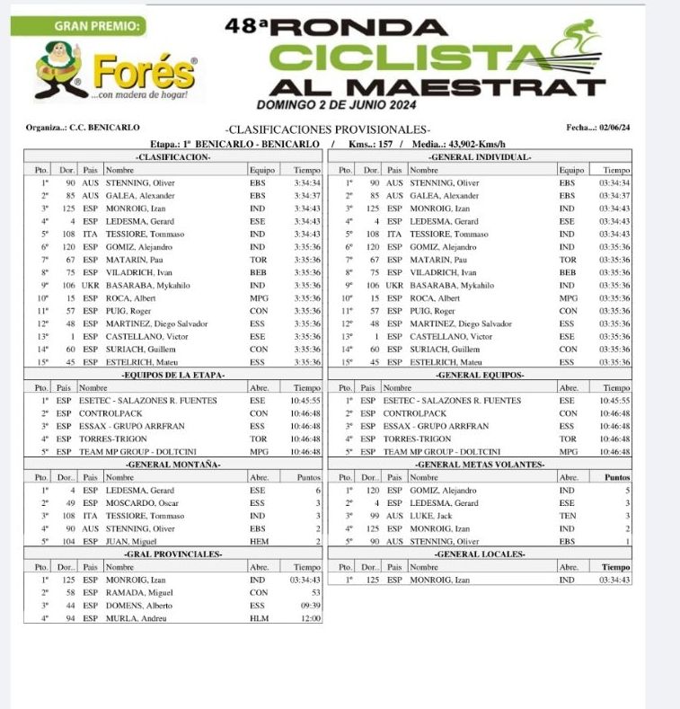 – 02 junio – 48º Ronda al Maestrat – Benicarló (Castellón). Clasificaciones