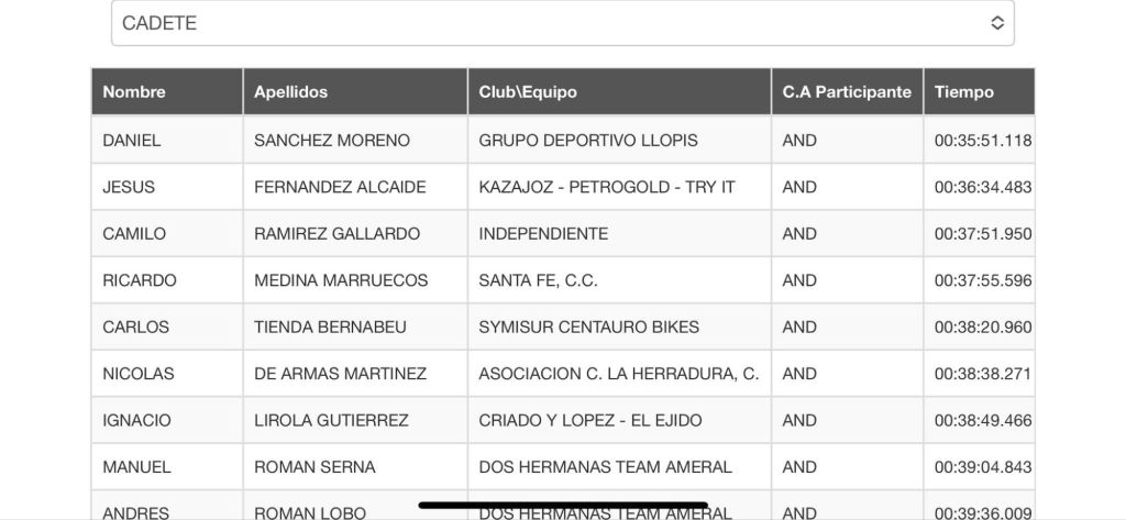 Dani Sánchez (GD Llopis) se adjudicó la ‘XXXIV Almuñécar Cota 1200’ de la categoría cadete. La carrera era puntuable para Ranking Andaluz Carretera, CAREBA Cadete/Júnior, Copa Andalucía de Féminas y el novedoso Premio de Montaña Ciclismo Carretera Diputación de Granada 2024.