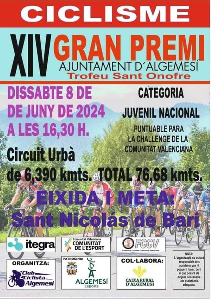 El sábado se disputa el XIV Gran Premio Ajuntament d’Algemesí-Trofeu Sant Onofre, a partir de las 16.30 horas, quinta prueba de la Challenge Ruta Comunitat Valenciana-Gsport 2024-Júnior. Se ha diseñado un circuito de 6,4 kilómetros al que se darán 12 vueltas hasta completar los 76,68Km. previstos por el CC Algemesí, organizador de la competición.