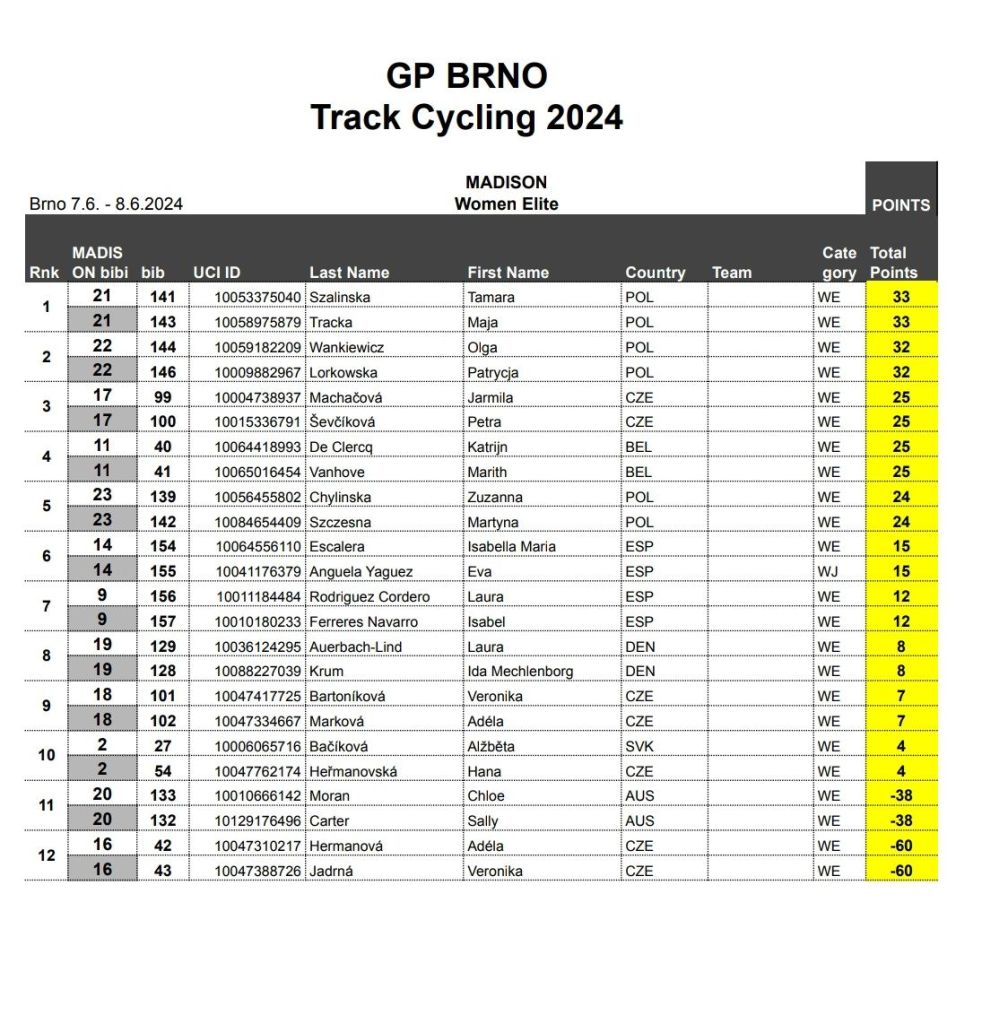 La Selección Española de Pista se encuentra en República Checa disputando el G. P. Brno, con categoría CL1. Izzy Escalera y Eva Anguela han sido 6ª en la Madison con 15 puntos y Laura Rodríguez e Isabel Ferreres, 7ª con 12 pts.