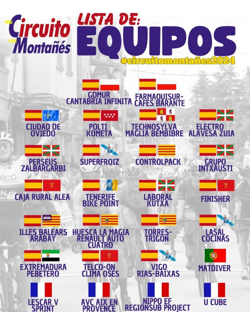 La prueba contará con participación de un total de 26 conjuntos llegados de todas parte de España de lo mejor de la categoría élite y sub 23. Además, entre las distintas formaciones destacará la presencia de cuatro equipos procedentes de Francia, Lescar V Sprint, AVC AIX En Provence, Nippo EF – Regionsub Project y U Cube; un portugués, Matdiver; y el equipo profesional Illes – Balears Arabay. Además, estarán en la salida: Farmaquisur – Cafés Barante, Ciudad de Oviedo, Polti Kometa, Technosylva Maglia Bembibre, Electro Alavesa, Perseus – Zalbargarbi, SuperFroiz, Controlpack, Grupo Intxausti, Caja Rural – Alea, Tenerife – Bike Point, Laboral Kutxa, Finisher, Lasal Cocinas, Torres -Trigón, Huesca La Magia – Renault Auto Cuatro, Telcon- Clima Oses y Vigo – Rias Baixas.