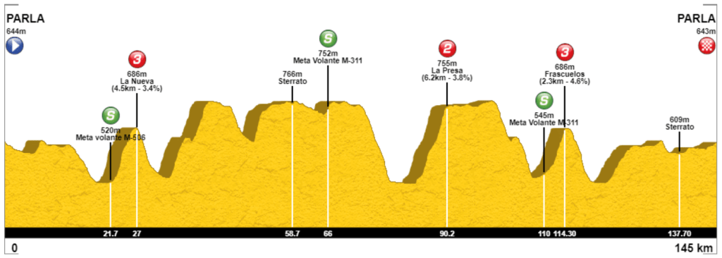 Un trazado rompepiernas que tendrá como puntos calientes los altos de montaña de La Nueva, La Presa y Frascuelo y 3 metas volantes, sin olvidar que se insertarán 2 tramos de tierra (sterrato), en Belmonte del Tajo y Vereda de Humarejos (entre Pinto y Parla), éste último a menos de 7 kilómetros para la llegada.
