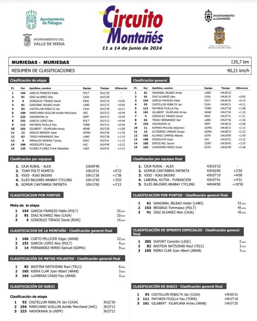 Pablo García (Polti Kometa) ha sido el ganador de la última etapa del Circuito Montañés que ha llevado al pelotón de Pontejos al Museo Etnográfico de Muriedas, tras 136 kilómetros de recorrido. Ander Ganzabal se ha llevado la prueba tras un final muy emocionante. Al ciclista vizcaíno del Laboral Kutxa le acompañaba en el podio Alex Díaz y Pablo García. El triunfo en la montaña ha sido para Edgar Curto; las metas volantes se lasha adjudicado Theo Penalva (Lescar V Sprint); y los sprints especiales para Raúl Bastida (Telco’m-ON Clima-Osés). El mejor sub-23 era Jan Castellón y su equipo, el Caja Rural-Alea, se hacía con la victoria en la general por escuadras.