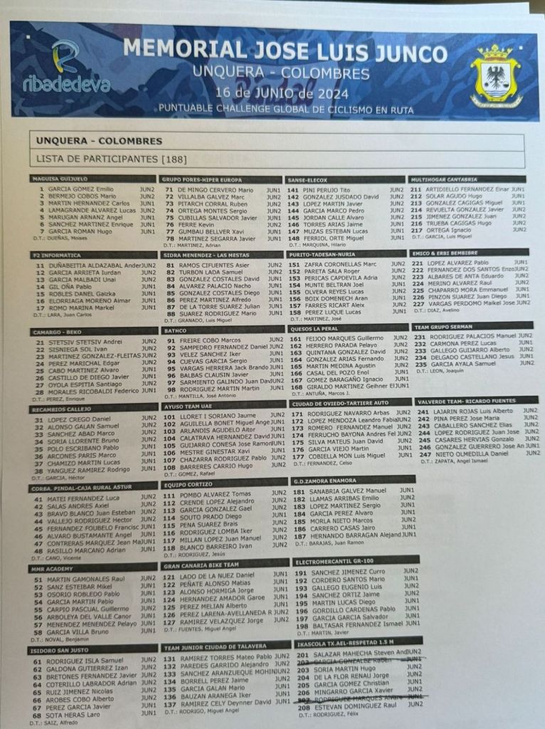 El domingo, día 16 de junio, se disputa en Unquera-Colombres el Memorial José Luis Junco para corredores júniors. La prueba contará con 104,39 kilómetros y comenzará a las 10 horas. Está organizada por el Club Ciclista Occidental y es una de las grandes carreras de un día del calendario nacional. Cuarta prueba de la Challenge Global de Ciclismo en Ruta Júnior que lidera Tito Pini (Sanse). Muy cerca en la General se encuentran los corredores del Grupo Forés-Hiper Europa Rubén Pitarch y Javier Cubillas. Además, la escuadra de la Comunidad lidera la clasificación por conjuntos tras las carreras disputadas en Amorebieta, Los Navalucillos y Sant Boi, en la que se impuso Cubillas. Completarán al Grupo Forés en la carrera cántabra Mario De Mingo, Marc Villalba, Sergio Ortega, Kevin Ferré, Xavi Gumbau y Javier Martínez, con Adrián Martínez como director.
