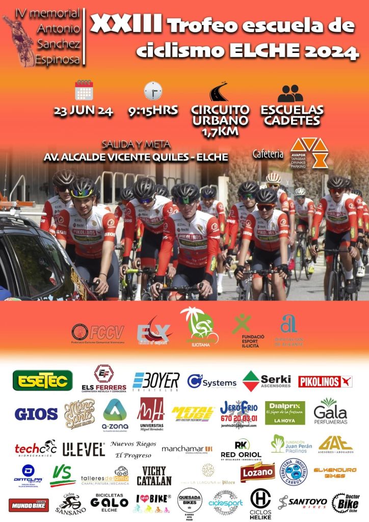 Ya tiene cartel el XXIII Trofeo de Escuelas de Ciclismo de Elche 2024 -IV Memorial Antonio Sánchez Espinosa, que se disputará el 23 de junio, para Cadetes y Escuelas, desde las 9:15 horas en la Avenida Alcalde Vicente Quiles de la ciudad Ilicitana. Los interesados en participar en esta nueva prueba de la Challenge de Escuelas de Ciclismo de Alicante pueden inscribirse en la web de la FCCV. La competición se desarrollará en un circuito urbano de 1.700 metros.