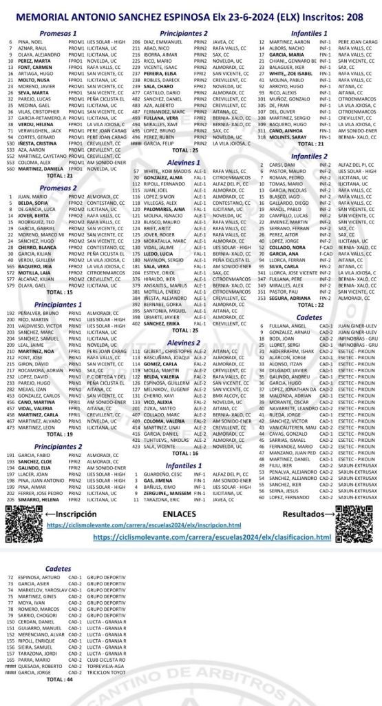 El XXIII Trofeo de Escuelas de Ciclismo de Elche 2024 -IV Memorial Antonio Sánchez Espinosa, que se disputará el domingo 23 de junio, cuenta con 44 ciclistas Cadetes inscritos y 208 de Escuelas. La competición comenzará a las 9:15 horas en la Avenida Alcalde Vicente Quiles de la ciudad Ilicitana. La competición se desarrollará en un circuito urbano de 1.700 metros.