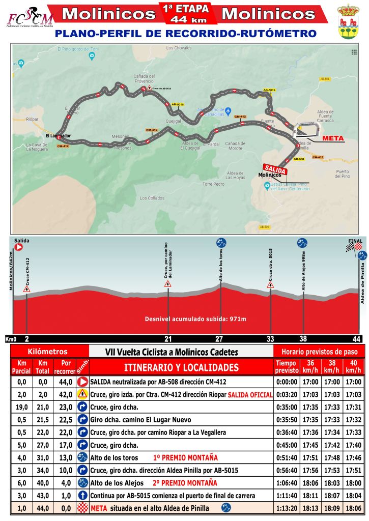 ETAPA 1. Molinicos-Molinicos 17:30 h., sábado 22. 44 km. Cuenta con un final de vértigo en el tercer puerto de la jornada: el Alto de Pinilla, de 3ª categoría. Antes, los corredores habrán superado el Alto de los Toros, de 2ª categoría, y el Alto de los Alejos, de 3ª. Lista de inscritos.