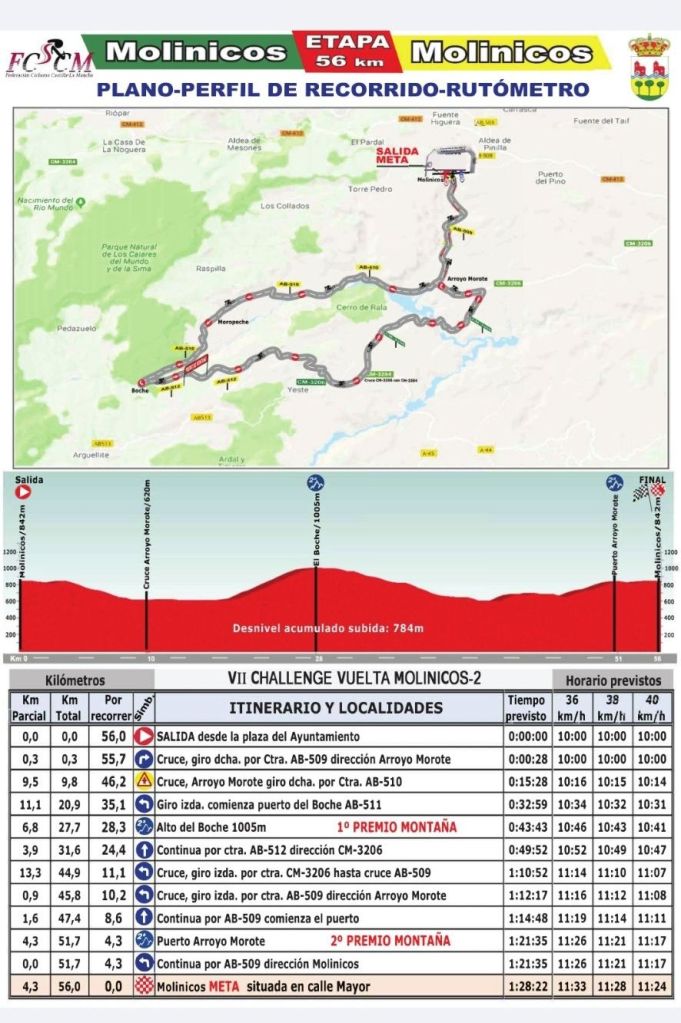 ETAPA 2: 10 h.. Domingo 23. Molinicos-Molinicos. 56 Kilómetros. La etapa mítica de Molinicos, con el Puerto de Boche como principal hándicap y, como novedad, el cambio de ubicación de la línea de meta, que pasa a ser en una línea recta de 300 metros, pero picando hacia arriba: una rampa al 3%.