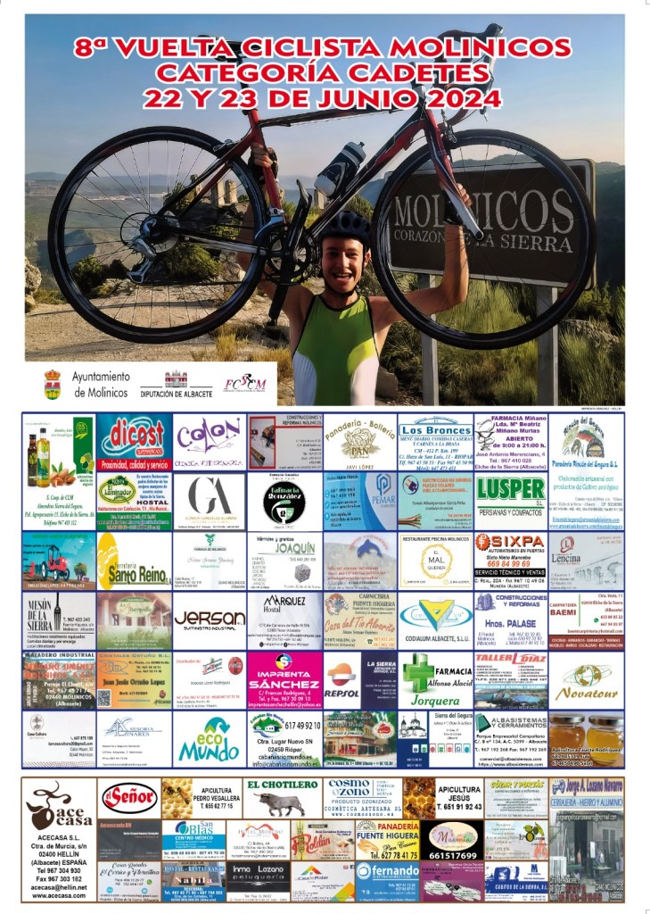 La VIII ‘Vuelta Ciclista Molinicos Cadetes’ , que se disputará los días 22 y 23 de junio en la localidad serrana, cuenta con 200 corredores distribuidos en 24 equipos llegados de casi todo el territorio español. Se pondrán el dorsal los corredores de los equipos Infinobras-Grupo Sime, Saxun Etrusax Primoti, Grau Pascual Netlar, Lucta Granja Rinya, Sumistock Sepelaco, Ikascol TX., Juan Giner Ulevel Vitadinsport, Guerola y GD Llopis. Lista de inscritos. Muchos de esas escuadras competirán también en Elche el domingo, por lo que la mayoría de sus corredores tendrán la oportunidad de competir.