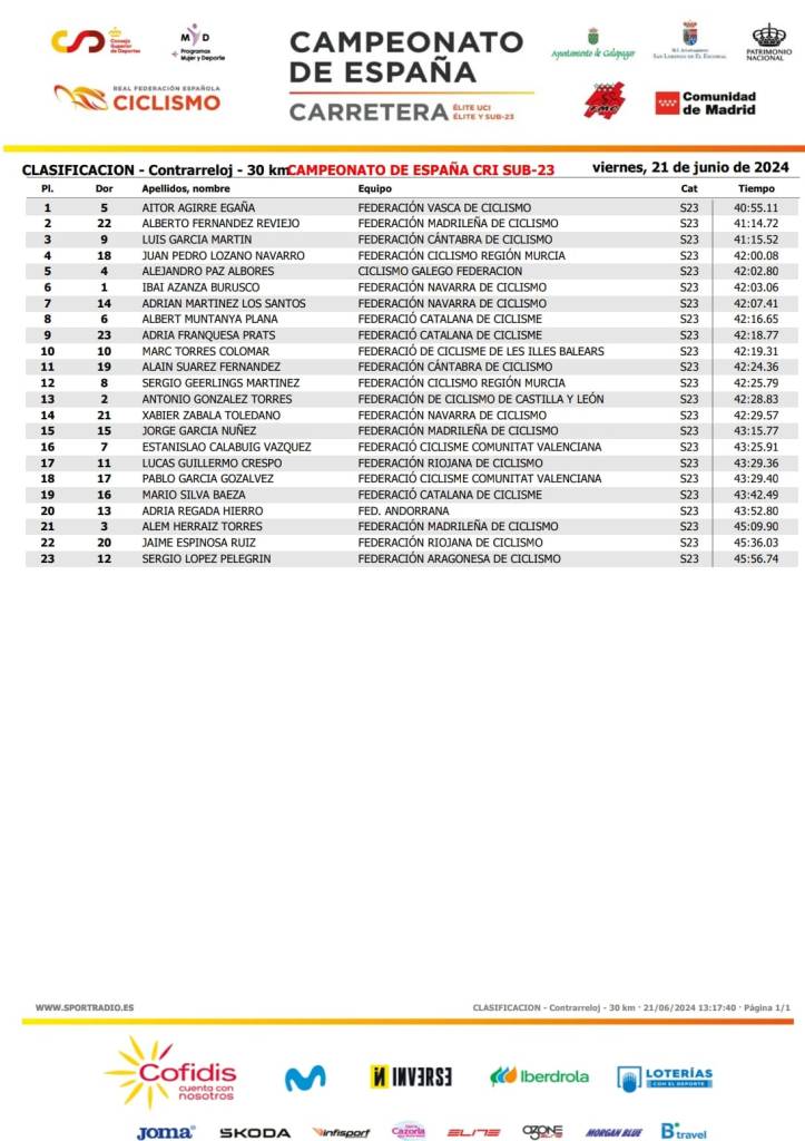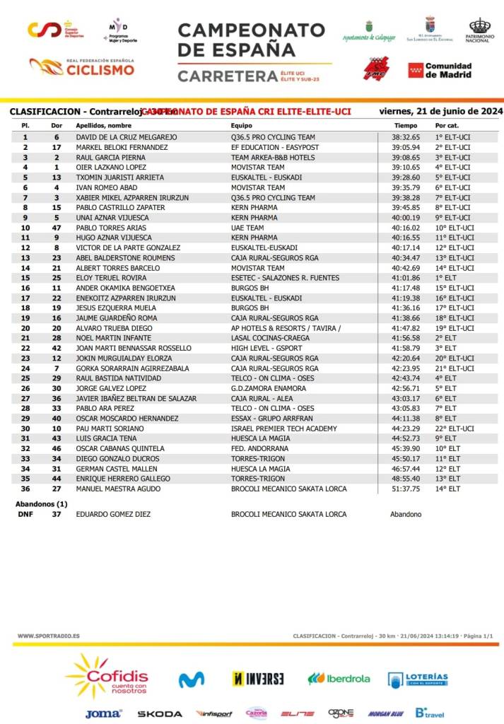 De la Cruz ha parado el reloj en 38’32”, mientras que el segundo mejor crono lo ha marcado con un tiempo de 39’05” Markel Beloki, que en su primer año como profesional, sin haber cumplido aún los 19 años, ha protagonizado una actuación brillante que señala su enorme potencial y talento. La tercera plaza se la ha llevado Raúl García Pierna, que ha parado el reloj en 39’08”, para regresar al podio del Campeonato de España tras su éxito del 2022. En cuarta plaza ha concluido Oier Lazkano, al que le han faltado dos segundos para hacerse con el bronce; mientras que en quinta posición ha finalizado un brillante Txomin Juaristi y en sexto puesto, Iván Romeo.