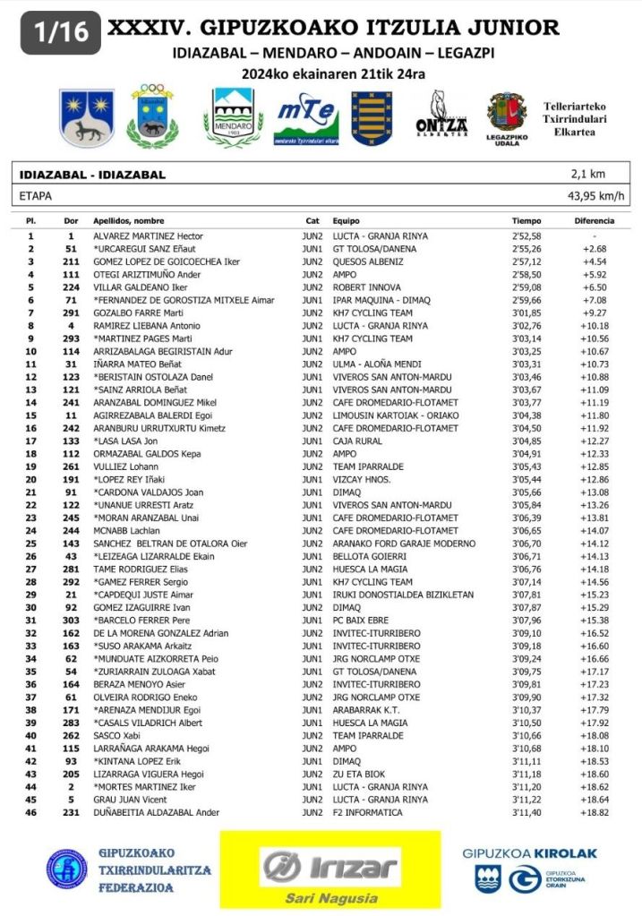 Héctor Álvarez (Lucta Granja Rinya) sigue de líder en la Gipuzkoako Itzulia Júnior. Ganó la edición de 2023 y hoy se ha impuesto en el prólogo de la ronda vasca disputado sobre una distancia de 2,1 kilómetros en Idiazabal. Eñaut Urcaregui (Tolosa) ha sido segundo e Iker Gómez (Quesos Albeniz) ha completado el podio de esta jornada inicial. Toni Ramírez (Lucta Granja Rinya) ha terminado octavo.
