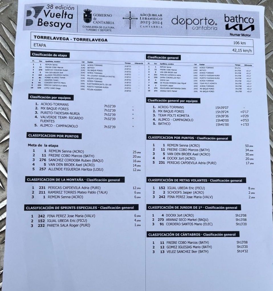 Remijn lidera también la clasificación de los tiempos; Adrià Pericas (Purito), la de la montaña; José María Pina (Valverde Team), la de los SE; y Eric Igual (Picusa Team), la de las Metas Volantes.