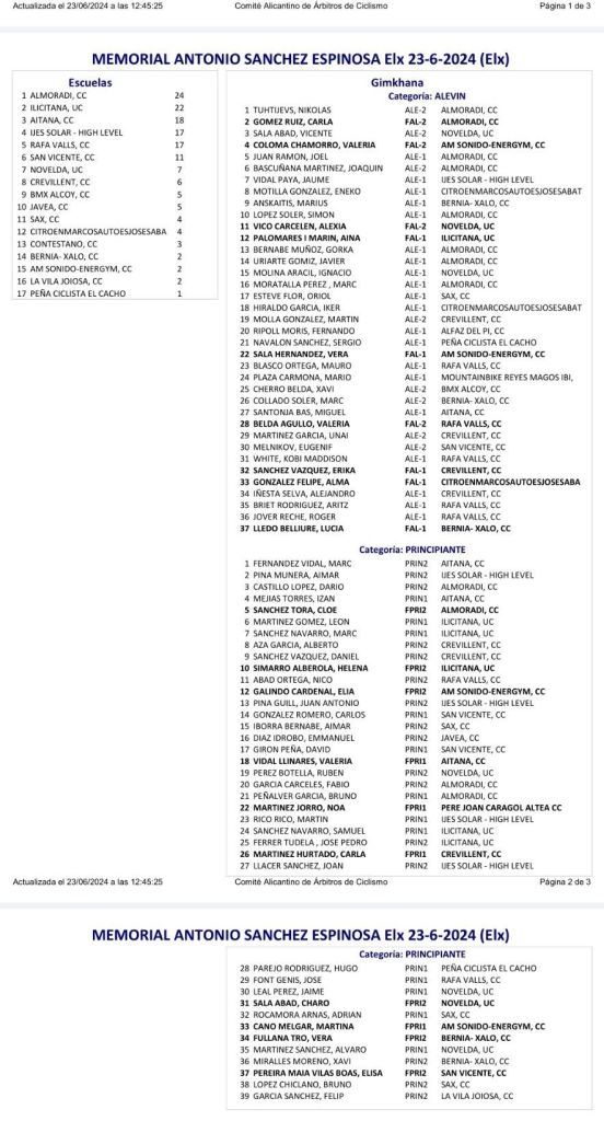 El CC Almoradí se impuso en el Memorial Antonio Sánchez Espinosa de Escuelas de Ciclismo disputado el domingo en Elche. La Unión Ciclista Ilicitana finalizó segunda y el Aitana tercero. Espectacular organización y jornada de ciclismo en la que no faltó la prueba de cadetes con el triunfo del corredor de casa Óscar Morante. Una auténtica fiesta deportiva.