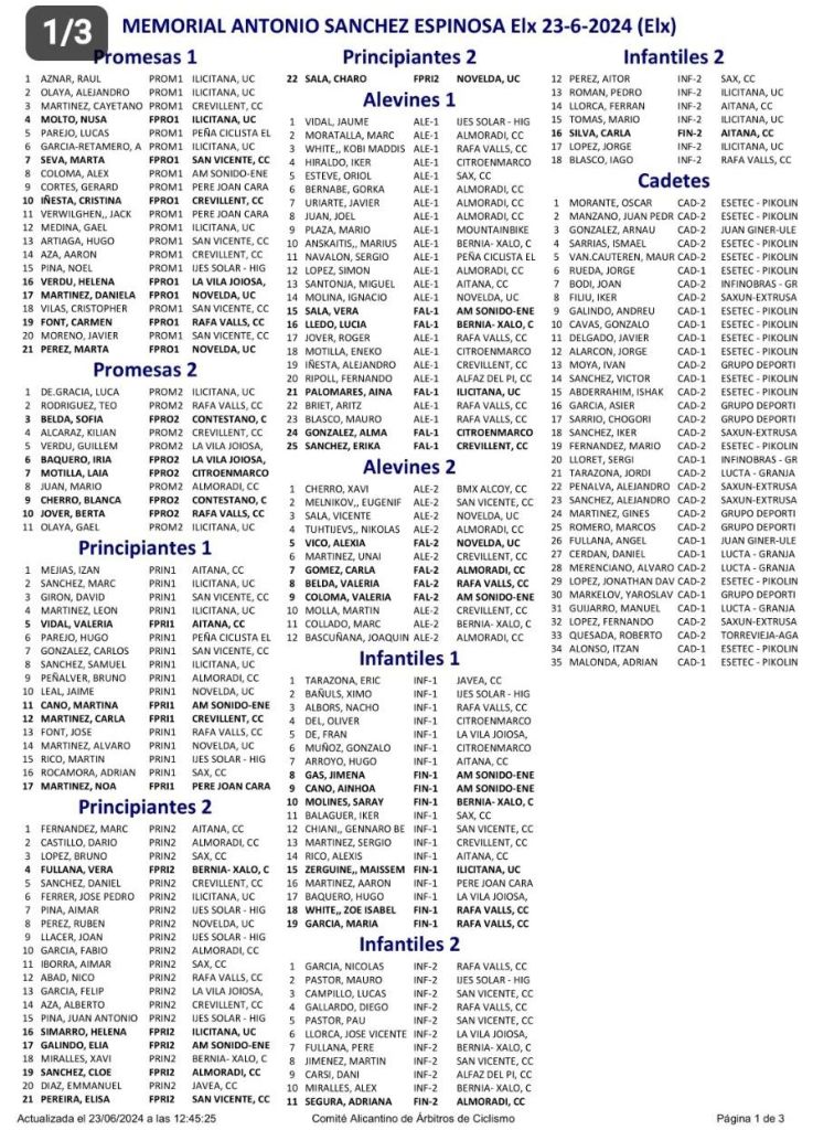 A nivel individual, victorias de Raúl Aznar (UC Ilicitana) y Nusa Moltó (UC Ilicitana), en Promesas 1; Luca de Gracia (UC Ilicitana) y Sofía Belda (Contestano), en Promesas 2; Izán Mejías (Aitana) y Valeria Vidal (Aitana), en Principiantes 1; Marc Fernández (Aitana) y Vera Fullana (Bernia Xaló), en Principiantes 2; Jaume Vidal (Ijes Solar) y Vera Sala (AM Sonido), en Alevines 1; Xavi Cherro (Bmx Alcoy) y Alexia Vico (Novelda), en Alevines 2; Eric Tarazona (Jávea) y Jimena Gas (Am Sonido), en Infantiles 1; y Nicolás García (Rafa Valls) y Adriana Segura (Almoradí), en Infantiles 2.