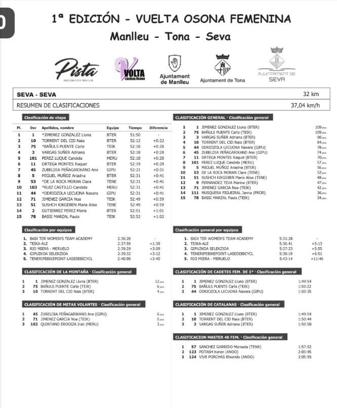 Lluna Jiménez (Baix Ter) se ha impuesto en solitario en la segunda etapa de la Vuelta Osona Femenina, categoría cadete, con 22 segundos sobre su compañera Naia Torrent. Carla Bañuls (Teika Alé) ha entrado tercera a 28 segundos. A falta de una jornada para el final, Jiménez es la nueva líder, con el mismo tiempo que Carla Bañuls. Las espadas están en todo lo alto. Jiménez comanda también la clasificación de la Montaña y Ane Zubeldía, las Metas Volantes. Manuela Sánchez (Tenerife) comanda la de las M40.