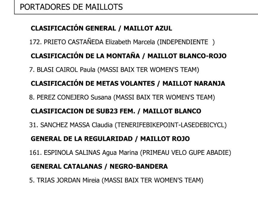 Gran actuación de la escuadra universitaria filtrando a Nicol en cabeza, consiguiendo el segundo puesto en premios de montaña y siendo mañana portadora del maillot cedido por Paula Blasi que es sub23. Y por otro lado gran trabajo en bloque en un segundo bloque intentando llegar a reforzar a Nicol en cabeza lo que les ha permitido ser segundos por equipos a escaso 1 minuto de Massi Tactic