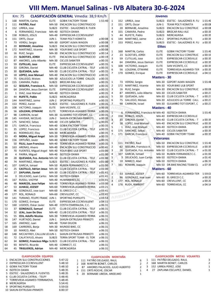 Carlos Martín (Gobik Factory Team ha sido el ganador en Albatera del VIII Memorial Manuel Salinas. Raúl Patiño (Encacon) ha sido segundo en un apretado esprint y José Urrea (Esetec-Salazones Ricardo Fuentes), tercero. Martín gana en la categoría Élite; Urrea, en Sub 23; Sergio Verdú (Gsport), en M30; Francisco Fernández (Isotech-Dama), en M40; Patiño, en M50; Jozsef Juhasz (Torrevieja), en M60; y Óscar Orts (Polti Kometa), en Júniors. Raúl Patiño se ha adjudicado las Metas Volantes y la Montaña y el Encacón se ha llevado el premio al mejor equipo.