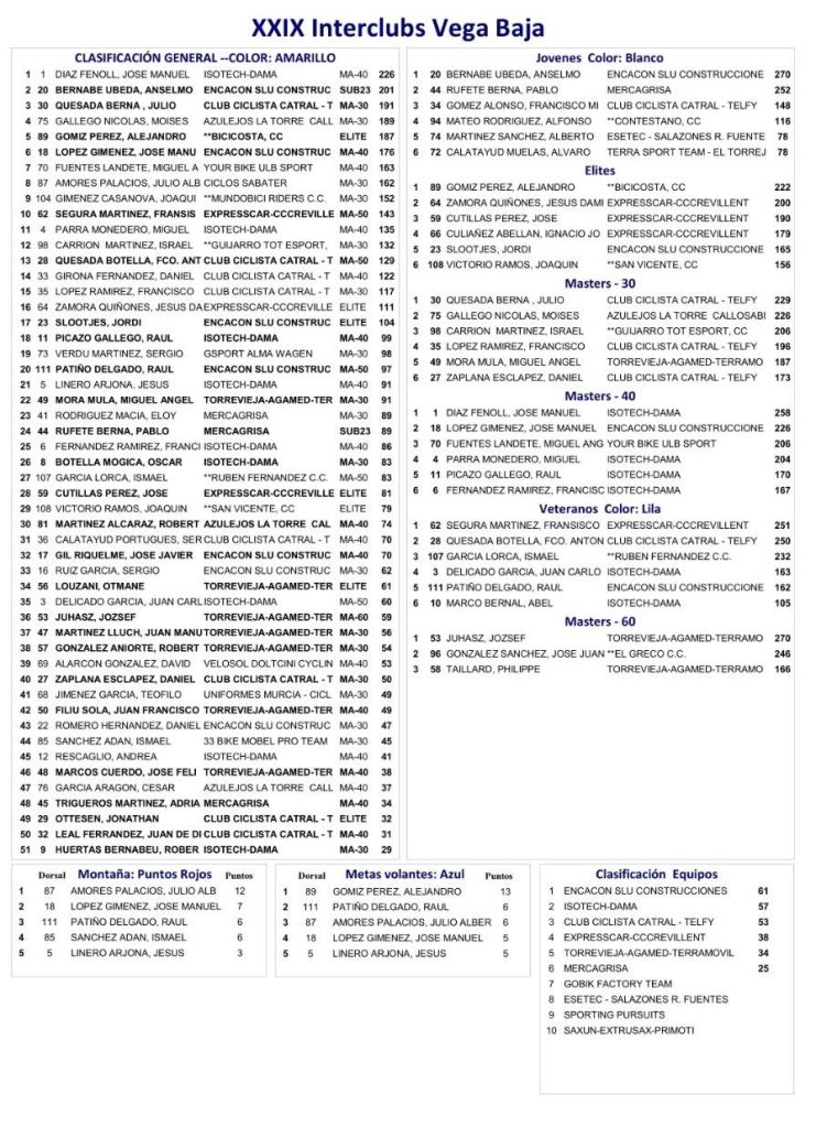 Además, Alejandro Gómiz (BiciCosta) domina la general de la categoría élite; Anselmo Bernabé (Encacon SLU) es el mejor Sub 23; Julio Quesada (Catral-Telfy) lidera a los M30; José Manuel Díaz Fenoll, a los M40; Francisco Segura (Expresscar Crevillent), en M50; y Jozsef Juhasz, en M60.