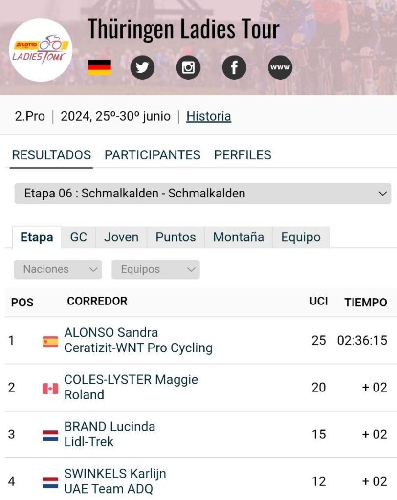 Sandra Alonso (Ceratizit) se ha impuesto en la última etapa de la Lotto Ladies Tour. Maggie Coles-Lister (Roland) y Lucinda Brand (Lidl Trek). La torrevejense, logró su segunda victoria de la campaña –y tercera de su carrera profesional- tras la cosechada en una etapa del Tour de Normandía. Con un duro ataque, Alonso levantó los brazos por muy poco, pues sólo 2 segundos le separaron de la canadiense Maggie Coles-Lyster (Roland) y de la neerlandesa Lucinda Brand (Lidl-Trek), segunda y tercera, respectivamente. Mireia Benito (AG Insurance-Soudal Team) finalizó sexta.