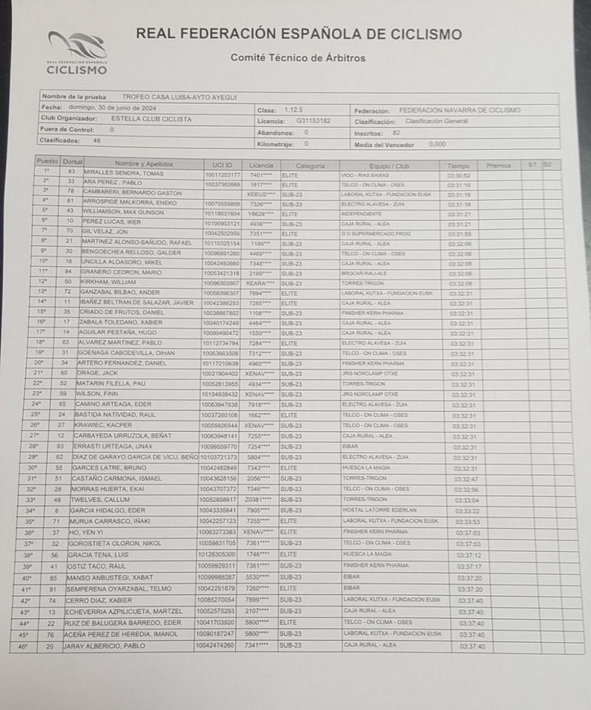 El alicantino Tomás Miralles (Rías Baixas) se ha impuesto hoy en solitario en Ayegui (Navarra) en el Trofeo Casa Luisa. Pablo Ara (Telco Osés) ha entrado segundo y Bernardo Gastón Cambareri (Laboral Kutxa). Miralles, que ayer fue cuarto en Murguia, ha atacado en Erául y de ahí a meta. La recompensa al trabajo bien ha tenido hoy su recompensa. Próxima parada, Vuelta a Ávila.