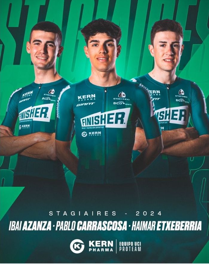 El Equipo Kern Pharma sigue apostando por su raíz, el Equipo Finisher, y dará la oportunidad a tres ciclistas del filial para seguir formándose entre profesionales hasta final de temporada. Ibai Azanza, Pablo Carrascosa y Haimar Etxeberria correrán con el conjunto navarro como stagiaires hasta final de temporada.