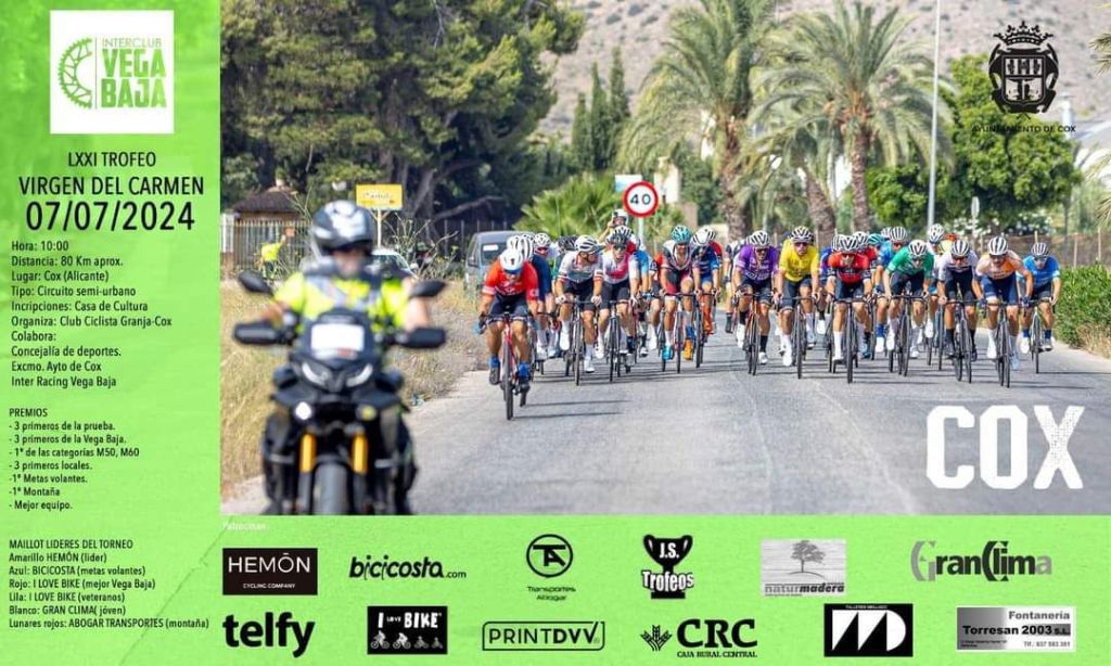 El domingo, día 7 de julio, se disputa en Cox el LXXI del Trofeo Virgen del Carmen. Una nueva prueba del Interclub Vega Baja con muchos años de existencia, que aporta solera al Torneo, que partirá a las 10 horas, cuenta con 78 kilómetros de recorrido y discurre por el ya tradicional circuito que cuenta con la subida a «Jaboneras» de Cox.
