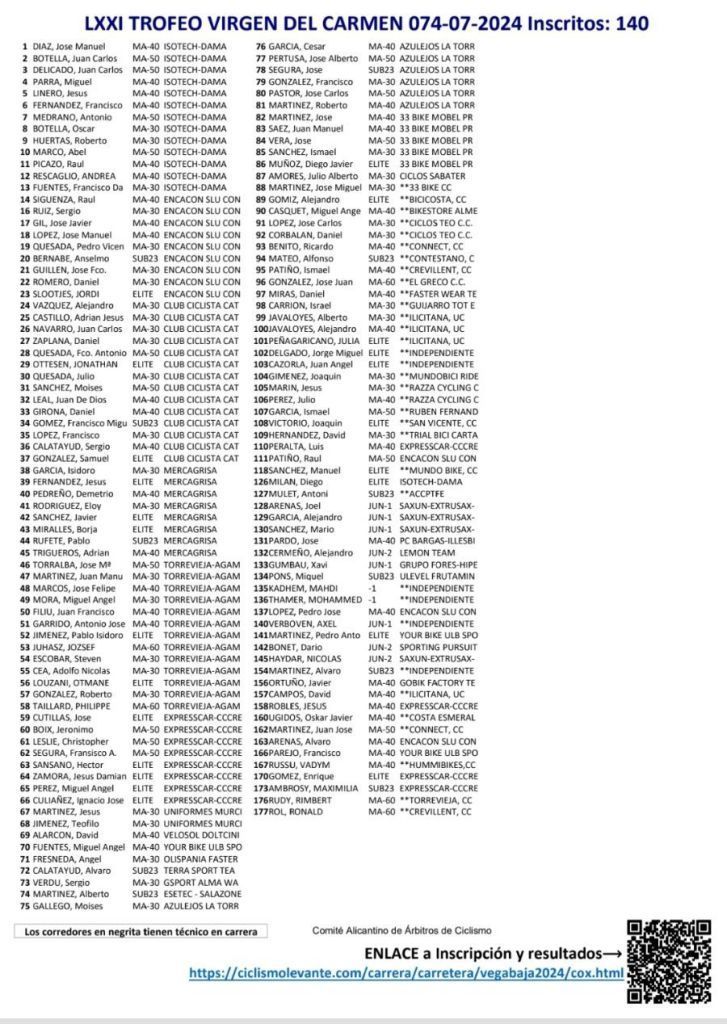 Además, Alejandro Gómiz (BiciCosta) comanda la general de la categoría élite; Anselmo Bernabé (Encacon SLU) es el mejor Sub 23; Julio Quesada (Catral-Telfy) lidera a los M30; José Manuel Díaz Fenoll, a los M40; Francisco Segura (Expresscar Crevillent), en M50; y Jozsef Juhasz (Torrevieja), en M60.