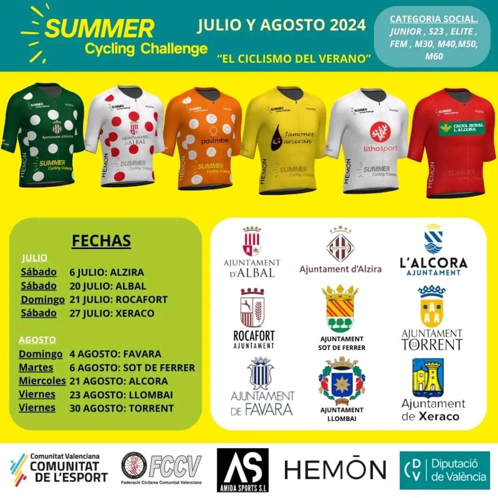 Este sábado, día 6 de julio, comienza en Alzira la Summer Cycling Challenge, un nuevo torneo ciclista de categoría social por etapas con sede en municipios de València y Castellón para todos aquellos que quieran disfrutar del mejor ciclismo durante el verano. Está formada por nueve pruebas en modalidad de circuito en formato challenge por puntos, distribuido en los meses estivales de julio y agosto. El resto de carreras estarán en Albal, Rocafort, Xeraco, Favara, Sot de Ferrer, Alcora, Llombai y Torrent.