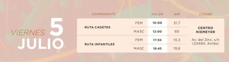 Las chicas cadete completarán un recorrido muy quebrado de 51,7 km por el entorno de Avilés; mientras que los chicos de la categoría completarán por esta misma zona 60 km, también plagados de repechos y pequeñas cotas que depararán una carrera nerviosa y emocionante.